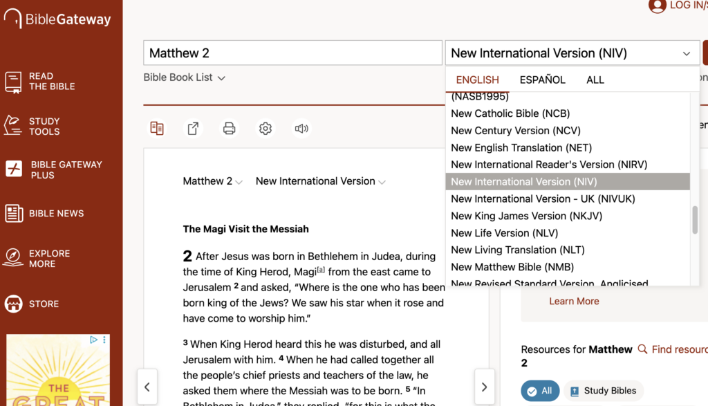 Here is a sample page in which the NIV version is selected to read Matthew, chapter 2.