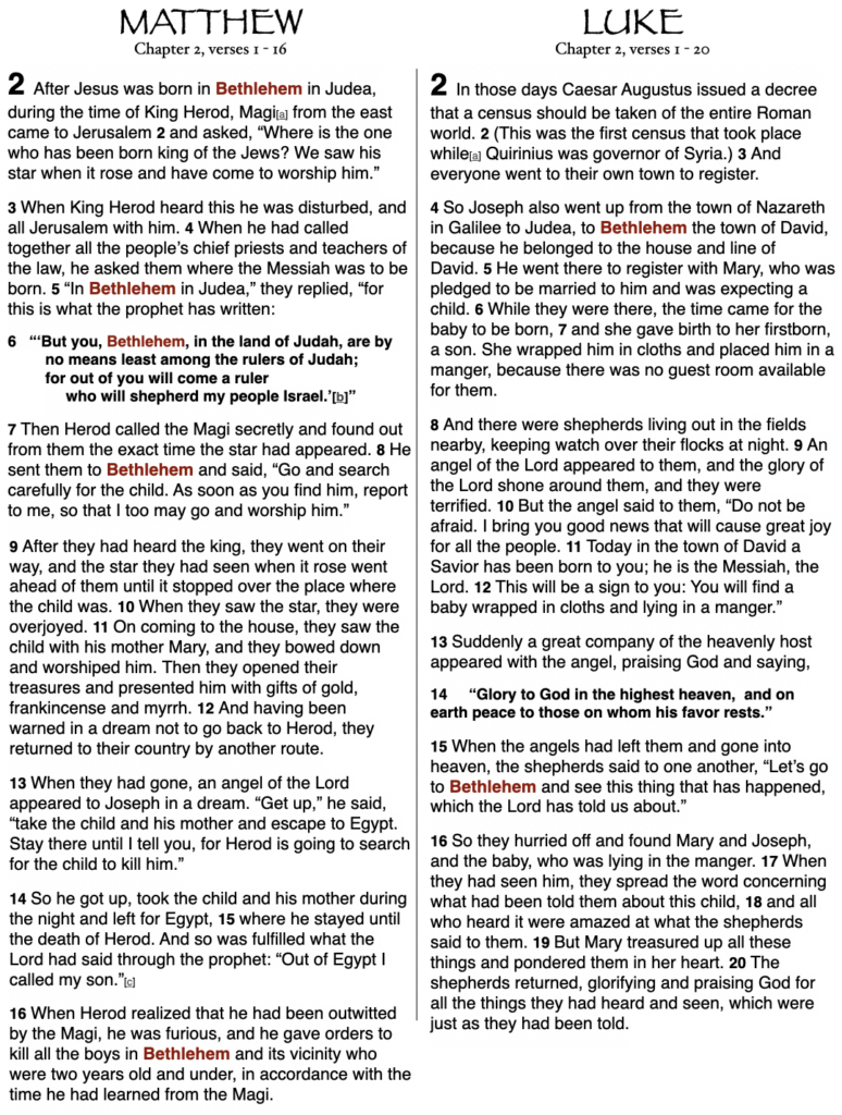 - –> The description of Mary’s reaction to her pregnancy, the reason for Mary and Joseph’s travel (government decree to go to your place of ancestry, be counted [census], and be taxed), the deascription of couple’s travel to Bethlehem, the actual birth “in a manger,” and the visit from the shepherds… is in Luke’s account, but not in Matthew’s account.