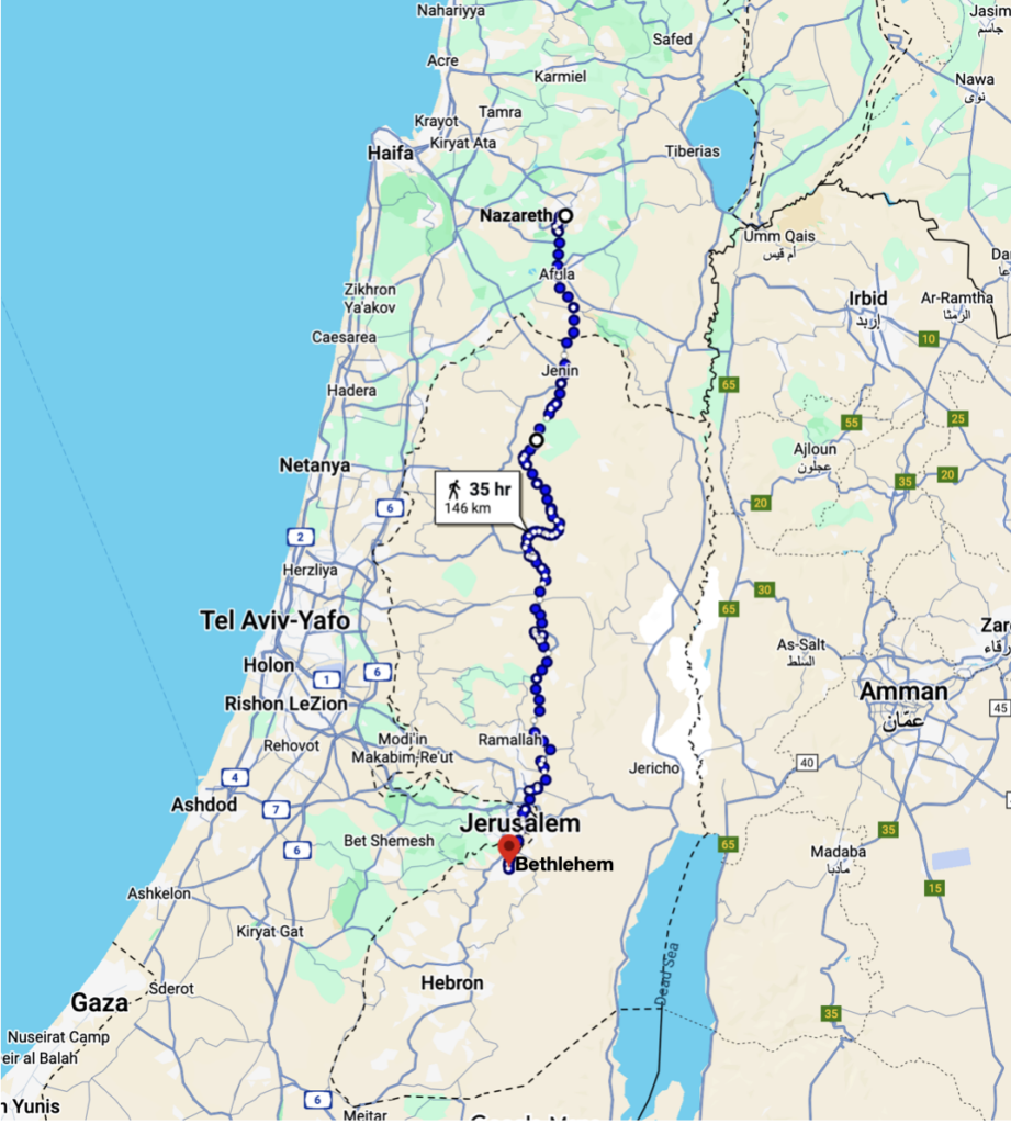 But if we are talking about Mary (9 months pregnant) and Joseph making this trip 2000+ years ago, it is not likely that they could do 7 hours a day (continuous walking!). Make your own estimate of how many days it might have been.